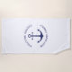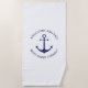 Custom Boat name or Family name, Welcome Aboard, nautical navy blue anchor white background Beach Towel.