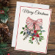 A large watercolor illustration of a Christmas floral arrangement decorates the front of this festive 5"x7" flat holiday card. Red, blue, and pink berries mingle with evergreen foliage, pine needles, and a bold red-and-white striped bow against a soft “floral white” background with red border. A script greeting, matching faded motif and personal name appear on the reverse side. Easily change, add-to or remove text to make it yours using the Template provided. Your choice of other sizes, paper types and envelope.