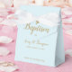The classic baby blue color, complete with a stylish bow, adds a charming touch to the favor box. The customizable gold hue for the "Baptism" script and dove symbolizes elegance and grace, reflecting the significance of the event.