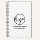 Custom black and white business notebook featuring a minimalist design with your logo along with two lines of text. These simple custom notebooks are great to give as client gifts or as promotional items / give aways for corporate events or trade shows.