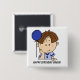 A little brown haired boy with a blue balloon and blue shirt on a button you can customise with your choice of text, his name, and age! Perfect for all who are attending the birthday party!