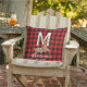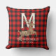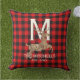 Custom outdoor patio throw pillow with red and black Buffalo Lumberjack clan checkers plaid tartan pattern deer with antlers silhouette image on a contemporary woodgrain textured background. With room to customise or personalise with family name monogram of your choice.