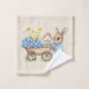 Introducing our Custom Bunny with Blue Flowers baby wash cloth! With a little rabbit holding blue wildflowers, a wooden cart with many blue wildflowers and a little house in the back, this baby wash cloth brings charm and playfulness to any room!