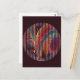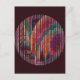 This customisable postcard features a rich burgundy background framing a circular striped artwork in vivid jewel tones—teal, coral, violet, and golden yellow. The fantasy-style architecture, swirling clouds, and surreal forest details are sliced into clean vertical lines, creating depth and mystery. It's a striking visual experience designed to elevate every piece of mail or packaging it accompanies.