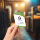 Clean custom employee badge with photo and text in modern curved standard presentation in violet,indigo,purple colors