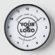 Replace the sample company logo and text with your own in the sidebar to create a stylish minimal wall clock for your business with a simple white background and a black rim. Your logo can be in colour or black and white. Bold black numbers around the edge make it easy to tell the time. Your text curves around the top and bottom of your logo. Click to customise further if you need to adjust the size of your logo with the scale buttons or to change the text colour.