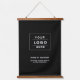 Modern black and white Custom branded Wood Topped Wall Tapestry features a business logo design centred on the front and framed by custom text that can be personalised with the name of the company, location, slogan, website, or other info. Black background and white text colours can be modified.