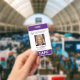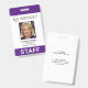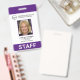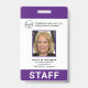 Corporate photo ID badge in a vertical layout. This simple yet professional design features a purple border on the top and bottom with white in the middle. The template is personalised with your logo, company name, employee name, title, department / location and employee ID. The bottom border has "STAFF" in large bold letters and may be changed to any title desired. The backside has your contact information and instructions for returning if found. This classic design works great for any type of business.