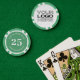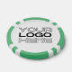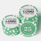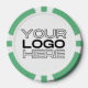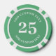 Personalised poker game chips with a custom business logo and your own text. This design in green includes the number 25 but it can be edited with any casino value amount.