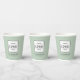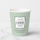 Custom branded paper cups feature your professional business logo design along with custom text that can be personalised with the name of the company, location, slogan, website, or other info. Light grey green background and black text colours can be modified. Design appears on the front and back of the cup.
