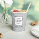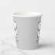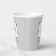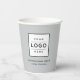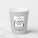 Custom branded paper cups feature your professional business logo design along with custom text that can be personalised with the name of the company, location, slogan, website, or other info. Light grey background and black text colours can be modified. Design appears on the front and back of the cup.