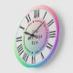 The artwork embodies refined elegance and a minimalist aesthetic, featuring twelve Roman numeral hour markers set against a whimsical, soft pastel rainbow-coloured background. This customised wall clock includes central placeholders ideally designed for incorporating a business logo, typography for the business name, slogan, or core values as appropriate.