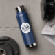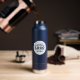 Custom navy blue branded water bottle features your professional business logo design, along with wording for your business name, slogan, website, location, or other information that can be personalised. Simply add your company logo to the white round placeholder image space, and fill in with your preferred wording.