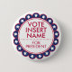 Whether you're campaigning to lead the country, your town, your school, your work, or independently supporting your favourite candidate, this eye-catching button will get noticed. Easily personalise this button with your own name and title or other custom text. This design features red, white, and blue colours with a circle of white stars. (Tip: For a two word candidate title such as "Vice President", you can change the word "For" to "Vice".) No minimum order quantity and no setup fee.