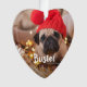 Customise this sweet heart-shaped ornament with two treasured photos of your furry friend. Your custom captions appear on the front and back in white hand lettered style brush typography. Shown with pet's name and the year.