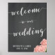 Custom chalkboard wedding reception sign print with pink flowers and customisable text - you can add bride's and groom's name and wedding date. Dimensions of the sign print (poster) are 22 inches by 28 inches.