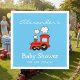 Personalised baby shower napkins with cute red choo choo train. Colourful toy locomotive design with date of birth or celebration. Adorable kids vehicle illustration. Create your own fancy babyshower napkins with customisable text. In pastel light pink purple yellow blue grey etc. Cute idea for new mum, mother to be. Also fun for childrens 1st Birthday party.