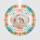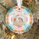 Custom Pretty Circular Family First Christmas Photo Gift Hanging Ornament. In festive colors of orange, teal green, and turquoise. A bold, round border surrounds the picture in the middle. Replace the photo with a picture of your own beautiful new baby boy or girl, family member, couple, or best friend. Personalize this by changing the words and picture. Give as a present for family at Christmas. Mama, mom, mam, mammy, mommy, mother, and your wife will love hanging up this gift decoration to celebrate the birth of their new baby and their first Christmas. In a lovely mixture of bright and merry colours.