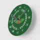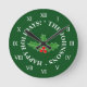 Custom Christmas wall clock for the Holidays. PErsonalized xmas home decor accessories for house or company office. Add your own name, seasons greetings, wishes, funny quote etc. Green or custom colour background. Roman numerals dial face. Holly leaves and red berries.