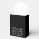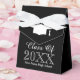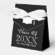 Custom class school graduation party favor boxes. Elegant black and white boxes for graduate students celebrating their grad year. Add your own high school name and year. Stylish typography template with tassel hat logo. Customizable background color and bow color. Bulk gift idea for him or her.