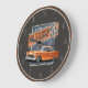 This is a rendering of a orange American classic car with vintage style graphics in the background for a retro look.