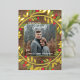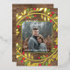 Contemporary classic Christmas holiday season red, green and gold foil coloured Holly berries and leaves wreath pattern on a weathered looking farmhouse style woodgrain shiplap planks background. With room to customise or personalise with a photo and family name or names of your choice on the front, and personal greeting or holiday message on the backside of the card.