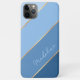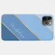 Contemporary pastel, light, medium, and dark classic blue-coloured striped cell phone case. With room to customise with a name, monogram, or initials of your choice. Beautiful, modern, and cool cover for the trend-savvy and art-loving hip trendsetter, artsy motif lover who wants to protect their phone from dust and dirt, wear and tear. This design is available in Apple iPhone 6, 7, and 8 Plus, 10 or X, XR, XS, 11, 12, 13 Mini, 14, 15 Plus and Pro Max cellphone cases. Show off your style, look fashionable, and feel stylish with a unique design on a mobile device accessory of your choice.