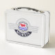 This is a standard metal lunchbox that appears to work just fine. We designed this box ourselves with an uploaded photo and custom text on the front and back. It looks absolutely beautiful except the front of the lunchbox is not centered like it shows in the photo. The print borders don't align with the inset flat part of the box where the preview photo online showed it perfectly centered in there. The back looks nice and centered though.