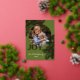 Contemporary classic Christmas holiday season greeting card with golden pine tree needles wreath leaves pattern on a classy dark green background, with real gold foil JOY wish text. With option and room to customise the text, family name and year date, and add a personal photo of your choice on the front, and a customisable season greeting message on the backside of the card.