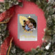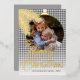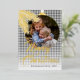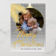 Contemporary classic Christmas holiday season greeting card with white coloured pine tree needles wreath leaves pattern on a classy white and grey gingham plaid tartan pattern background, with real gold foil Merry Christmas wish text. With option and room to customise the text, family name and year date, and add a personal photo of your choice on the front, and a customisable season greeting message on the backside of the card.
