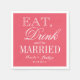 Custom colour background paper napkins for marriage. Eat drink and be married coral pink and white paper wedding napkins. Elegant script typography design for classy wedding party. Stylish handwritten calligraphy combined with chic formal fonts. Trendy template with customisable background colours. Cute vintage slogan for rustic country chic dinner table. Also great for rehearsal dinners, cocktail hour, bbq, reception etc. Personalised with name of bride and groom plus date of marriage. Beautiful formal wedding decor.