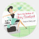Super cute "from my kitchen" or "from the kitchen of" food gift tag stickers with retro style housewife wearing an apron, little black dress and oven mitt, sitting on her stove, happy to be cooking or baking. Awesome package labels for your homemade treats. Changing the background colour changes the whole colour scheme.