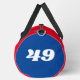 Custom colour jersey number sports team duffle bags. Great for gym, fitness, workout, work and sports like football, hockey, soccer, volleyball, lacross, handball, basketball, baseball, softball and others. Personalise with your own name. Blue and red 49 example.