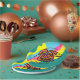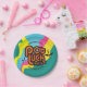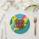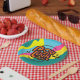 Super groovy pot luck dinner party or other bring-a-dish food event paper plates featuring bold "pot luck party" text and personalised with your choice of colour scheme, and text on the top and bottom.