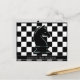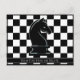 Show your love of the ancient game of Chess with this cool, customisable postcard. This design features a black knight chess piece in the centre of a default black and white classic chessboard background. The reverse side has a small knight chess piece in the top centre on a default light grey background. Just hit the Customise button to change the background colour or reverse side colour if you wish. There is a spot to personalise the card with your own text in default white print. Just hit the Personalise button to edit or delete the text, or the Customise button to change the font, size, or text colour. Great item for party invitations, notes, lovers of strategy games, Chess, Checkers, geometric designs, board games, and chess pieces. This design can be transferred to any item in the Zazzle marketplace.