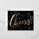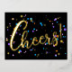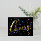 Contemporary classic new years holiday season greeting card with multi coloured and golden confetti fireworks pattern and cute real gold foil Cheers! calligraphy text. With option and room to customise the text, family name, return address, year date and a customisable season greeting message on the backside of the card.