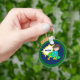 A boy in a cool blue and green superhero costume and cape next to a yellow action bubble personalised with your child's name. An awesome comic book style keychain.