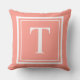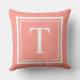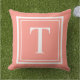 Stylish outdoor accent pillow features a serif monogram letter that you can personalise with your first or last name initial, framed by a simple double square frame in white colour with a coral / salmon pink background colour. You may customise the background colour to coordinate with your home decor.