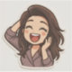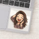 This adorable chibi-style sticker features a cheerful female character with long, wavy brown hair wearing a purple houndstooth-patterned blazer. Her expression is full of joy, with closed, happy eyes, blushing cheeks, and a wide open-mouthed laugh. One hand is playfully touching her hair, and the other rests near her face, enhancing the carefree and lively energy. The overall design is clean and vibrant, with soft outlines and a white border, making it perfect for digital or print sticker collections that express happiness or playful excitement.