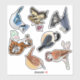 A selection of graphic birds and animals, reproduced from my own original illustrations. A raven on a skull with a key, a baby tiger and butterfly, a blue jay, a carolina wren, a black capped chickadee, a heart barn owl, and an eastern swallowtail butterfly and pink flowers.