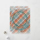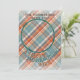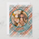 Unique, classic, cute and decorative Holiday season greeting card. With fun Happy Thanksgiving wish on a cosy warm colourful teal blue and orange red coloured plaid tartan pattern. With room to customise or personalise with your own cheerful photo and family name on the front of the card, and a customisable season greeting poem on the backside of the card with option for family member names.