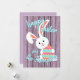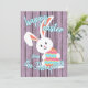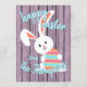 Pretty, trendy and modern 'Happy Easter' Spring season wish on a light spring lavender violet periwinkle coloured rustic farmhouse wooden planks style background, and a cute smiling bunny rabbit holding a colourful easter egg. With room to customise or personalise with your family name and text of your choice on the front, and a heartfelt poem message and personal names on the backside that can easily be personalised or customised with your own greeting text.