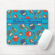A fun Mousepad to personalise, with a pattern of cute owls in red, blue, green on a turquoise blue background with a red, turquoise and blue border. The owl pattern is from an original handpainted paper collage design by Judy Adamson.