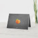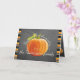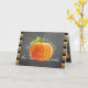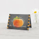 Cute 'Thanksgiving Greetings' text written in pretty typography, an orange Pumpkin on trendy blackboard background, surrounded by bright orange, lime green, white and black horizontal stripes pattern design. With room to customise the greeting on the font, and personalise with your family or corporate company name and photo of your choice on the inside. Tip: turn this card into a cute photo display by folding it inside out.