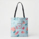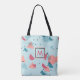 Classy, fun and contemporary pink, coral blush orange, teal blue green abstract geometric triangles, polka dots, stripes and half circles mosaic pattern on a pastel coloured background. With room to customise with a monogram or initial of your choice. Stylish original and cool tote bag for the trend-savvy and art-loving hip trendsetter, trendy look style motif lover.
