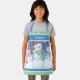 Adorable kids' kitchen chef apron featuring cheerful snowmen celebrating the December winter holiday season, holding colourful string lights, all set against a light green background with white polka dots. It offers space for personalisation, allowing you to add a name or short text of your choice. This unique, stylish, and decorative apron makes a perfect birthday or Christmas gift for loved ones, kids, friends, or family members who enjoy cooking or spending time in the kitchen.