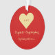 Custom, personalised, beautiful, festive christmas red, elegant, faux golden typography / script, golden heart, monogram, newlywed couple, husband & wife, first holiday christmas keepsake acrylic ornament. To customise, simply type in the name of the newlywed husband & wife, year, the couple's initials, and the family name / last name of the couple. Makes a wonderful keepsake for the bride and groom, newlywed couple.