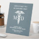 Make your office look professional with this Custom Doctors Office Business Hours Custom Name Pedestal Sign. It has a modern design with a white caduceus symbol and "MD" in bold lettering on the centre. The text is "welcome to" followed by personalised doctor's name on upper area. The hours of operation and "please have insurance cards ready" is under the symbol. Background is customisable dusty blue with white easy to read lettering. Click personalise this template option and follow the prompts.