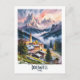 This watercolor travel artwork captures the serene beauty of a mountain village nestled amidst the iconic Dolomites in northeastern Italy. Snow-capped peaks of the Italian Alps rise dramatically above a cosy cluster of alpine homes, church spire, and twilight forests, rendered in soft pastel hues and painterly tones. This vintage-style design channels the charm of historic European postcards, celebrating Italy travel, mountain landscapes, and unforgettable vacation memories.