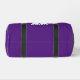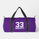 Custom duffle bag for basket ball team player. Handy for balls, towel and other equipment. Also great for other sports, fitness, gym, training, travel etc. Available in small and large sizes. Purple example. Personalise with name and jersey number.
